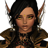 notable features. long elven ears with decorative earrings and jewels, gold diamond in between her brow, a beauty mark on the right side of her jaw and a gold nose piercing.